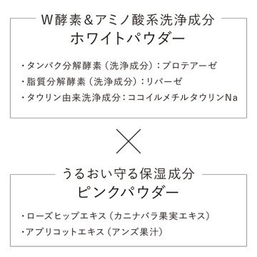 An enzyme cleansing powder that leaves your skin smooth and refreshed every day, washing away impurities for a clear feeling. It uses a white powder that thoroughly removes sebum and pore impurities, and a pink powder with moisturizing ingredients to protect hydration. By combining the two colored powders, each wash leads to smooth, pure bare skin with less visible pores and better makeup application. The scent features “Teatopia,” an accent of tea flower, blended with lily of the valley, rose, and gardenia for a fruity floral fragrance. *Cleansing ingredientsHow to use: